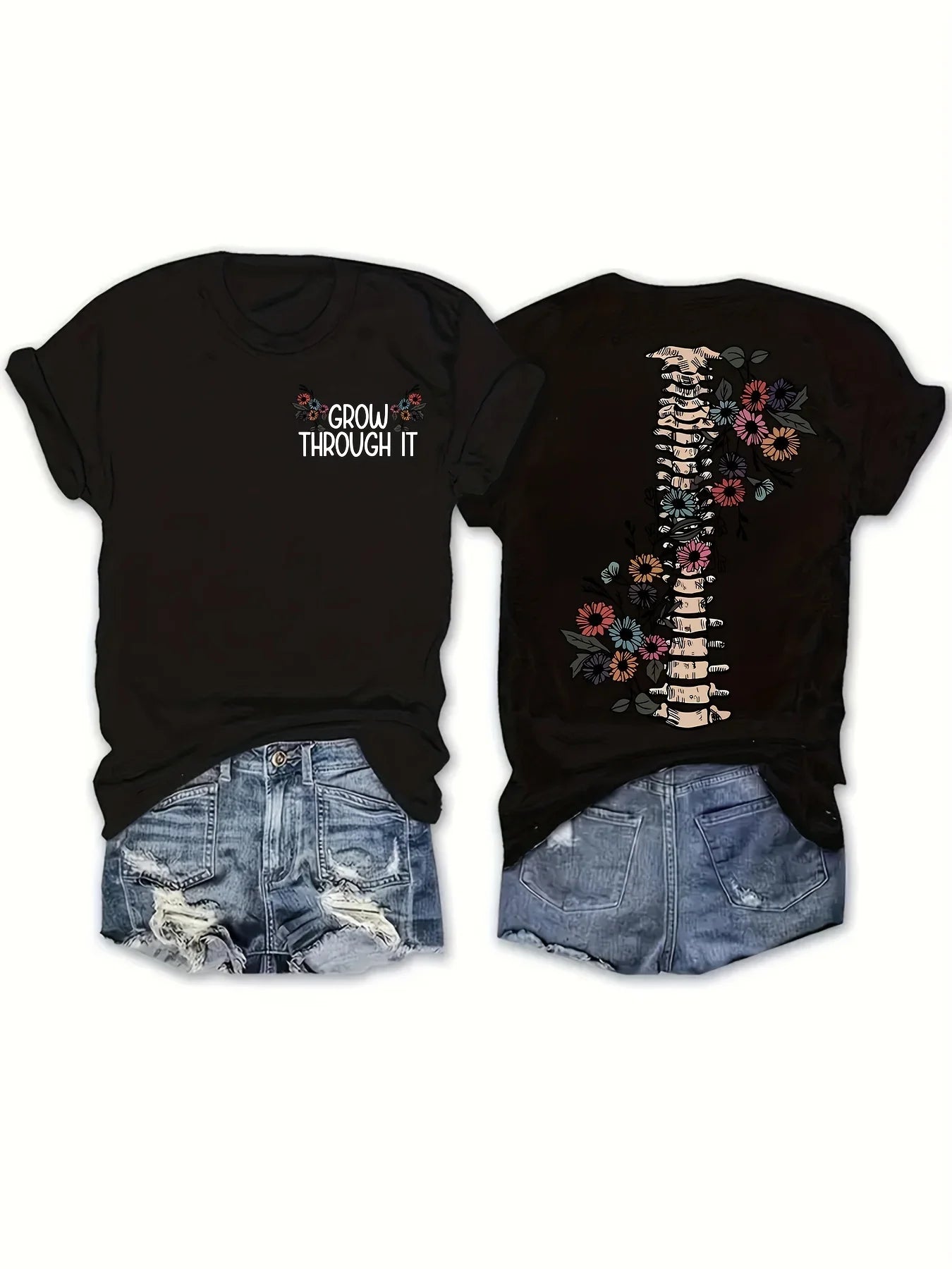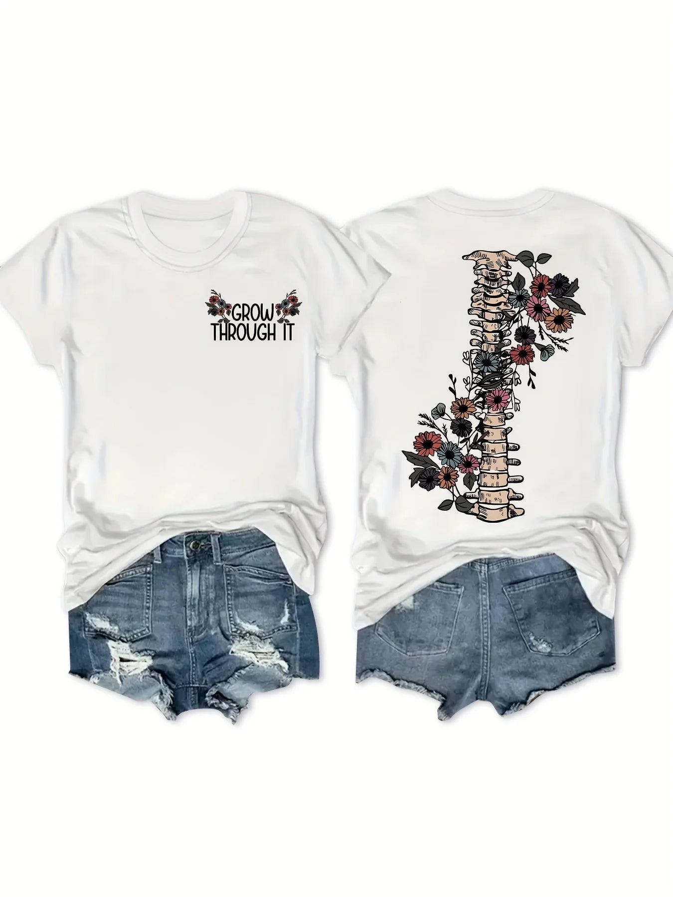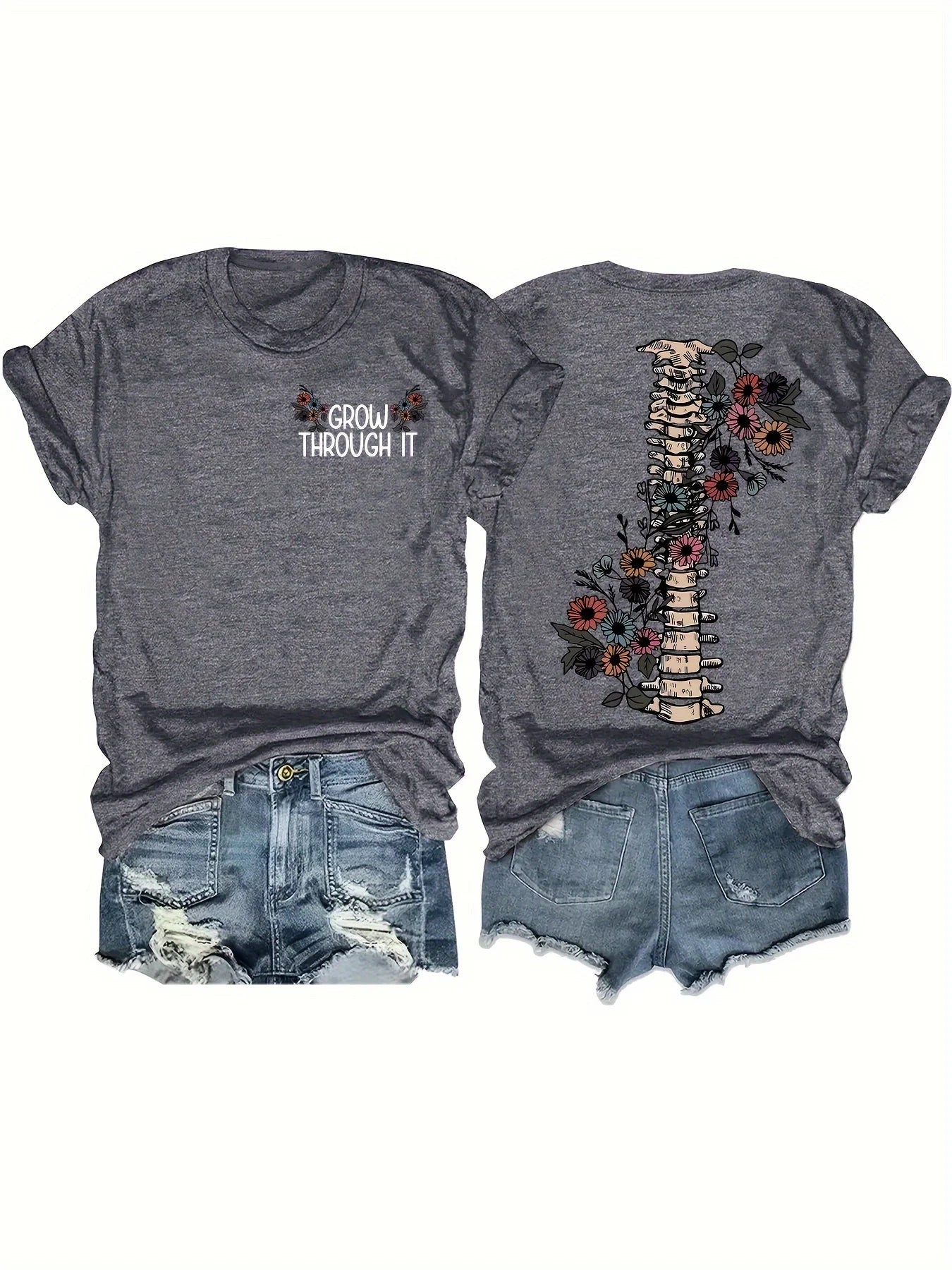 Grow Through It Women's Tee - Spine & Floral Graphic, Casual Gray Top