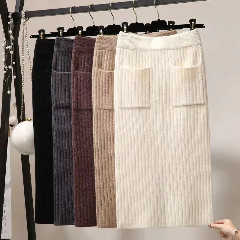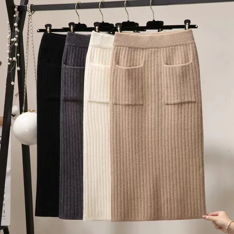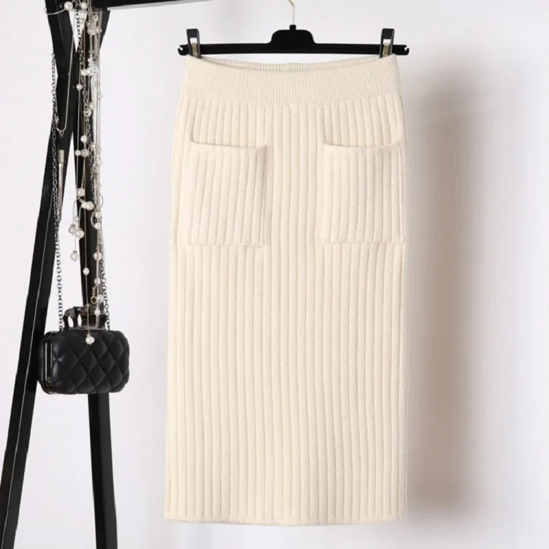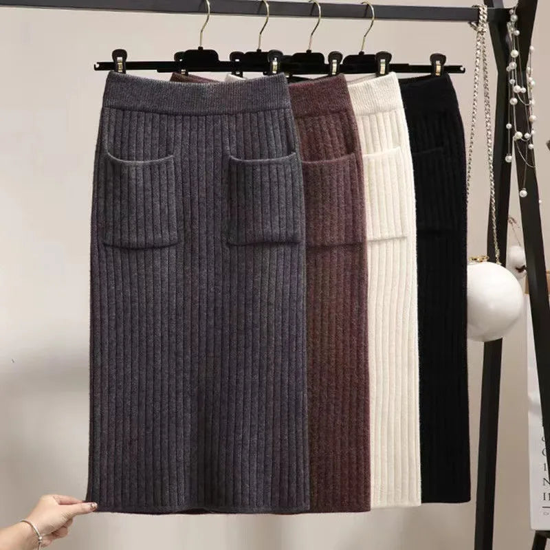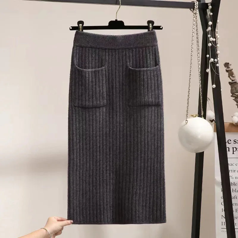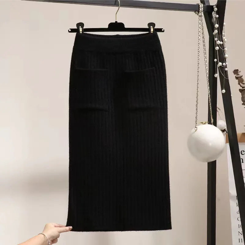 Spring Autumn Women's High Waist knitted Mid-Calf Elastic Skirt Promotions Lady Patchwork Wrap Hip Spilt Solid Color Skirts