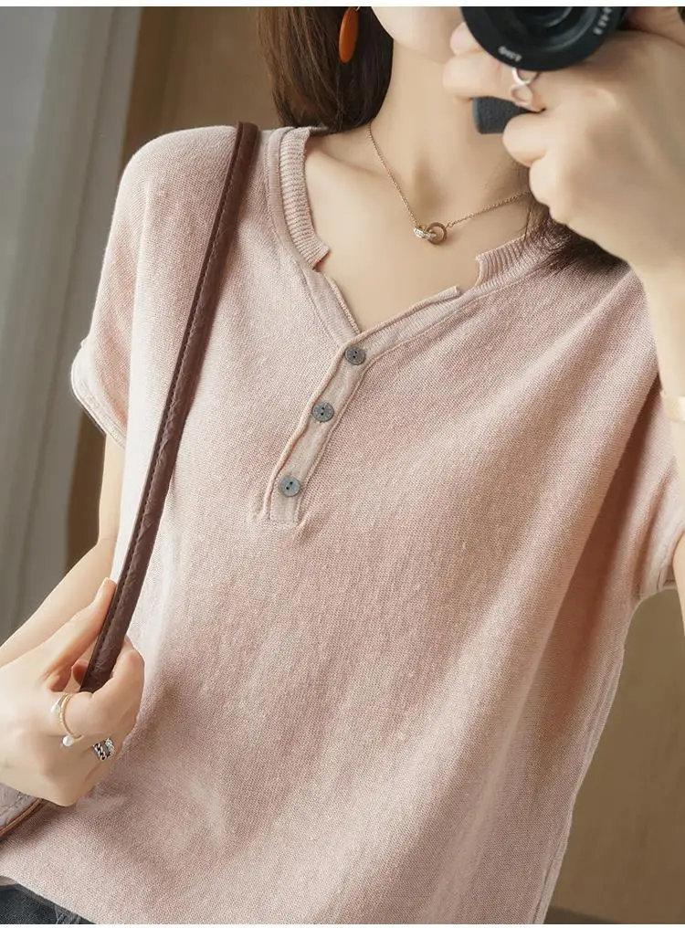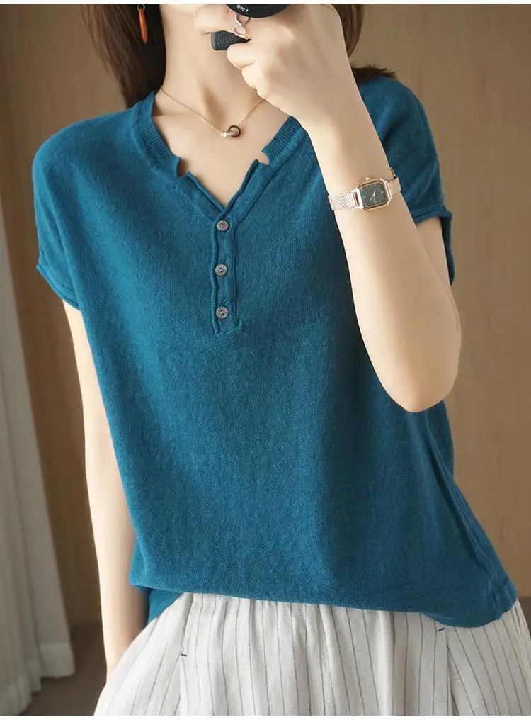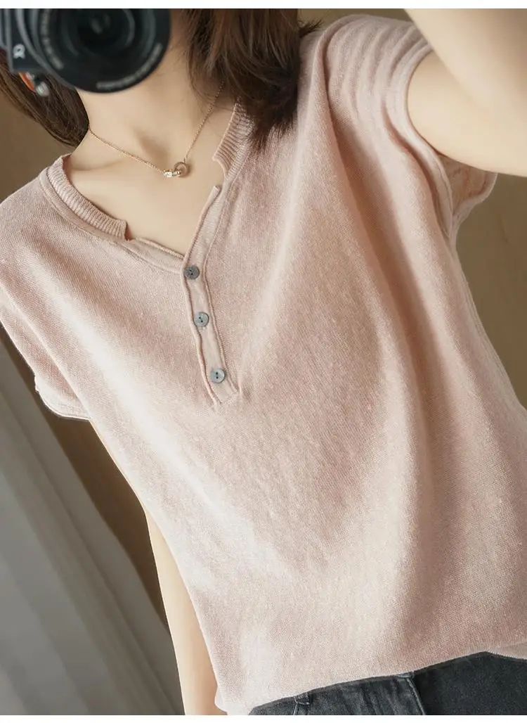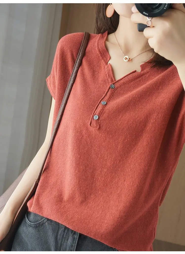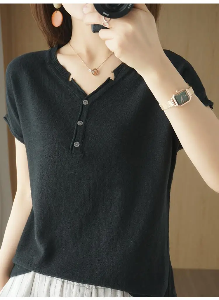 Summer 100% pure cotton women's T-shirt V-neck knitted short sleeved loose Tees solid color pullover button Tops basic versatile
