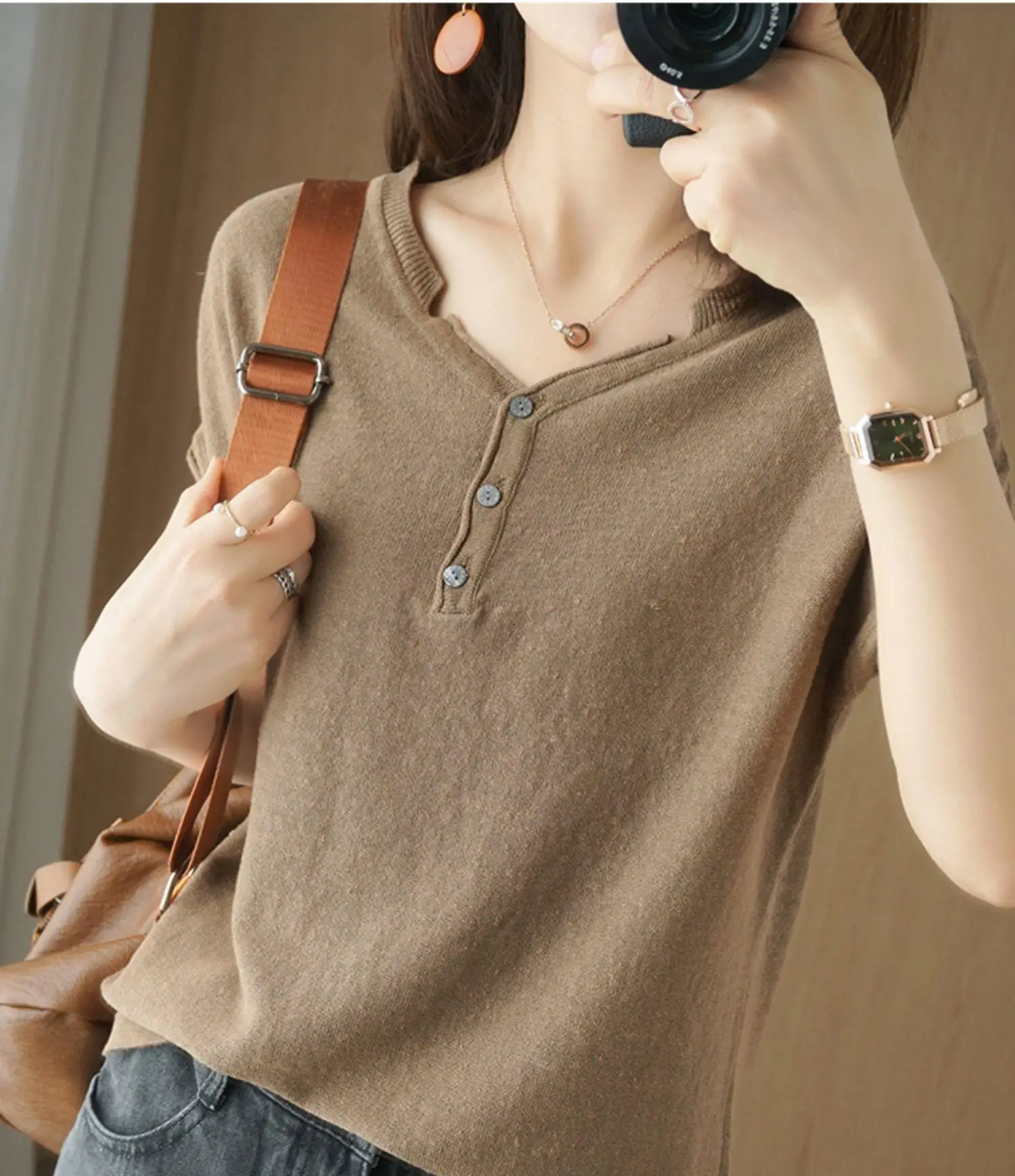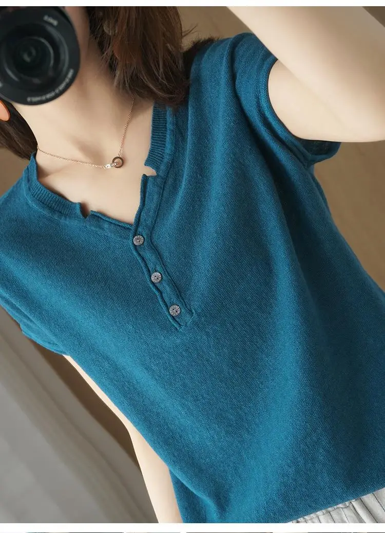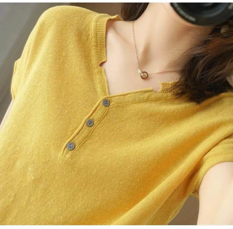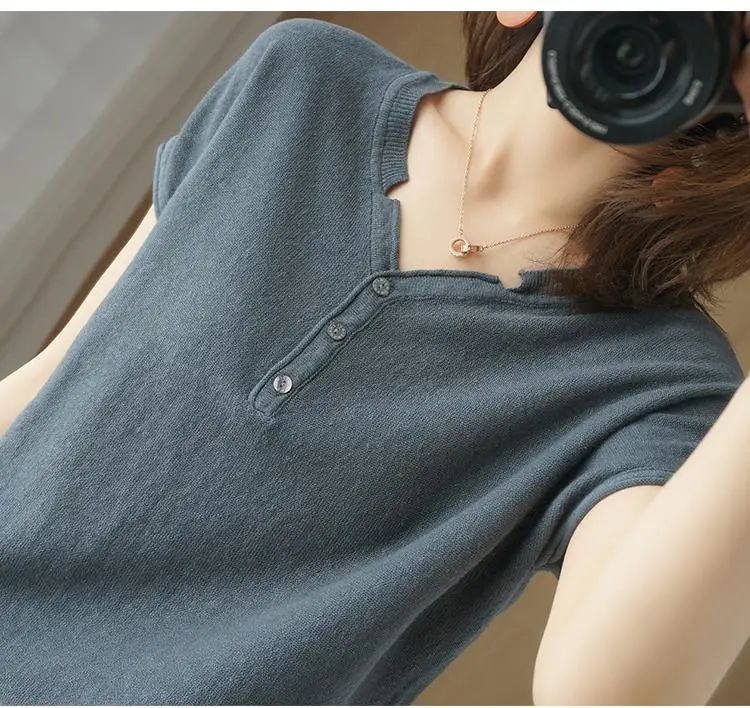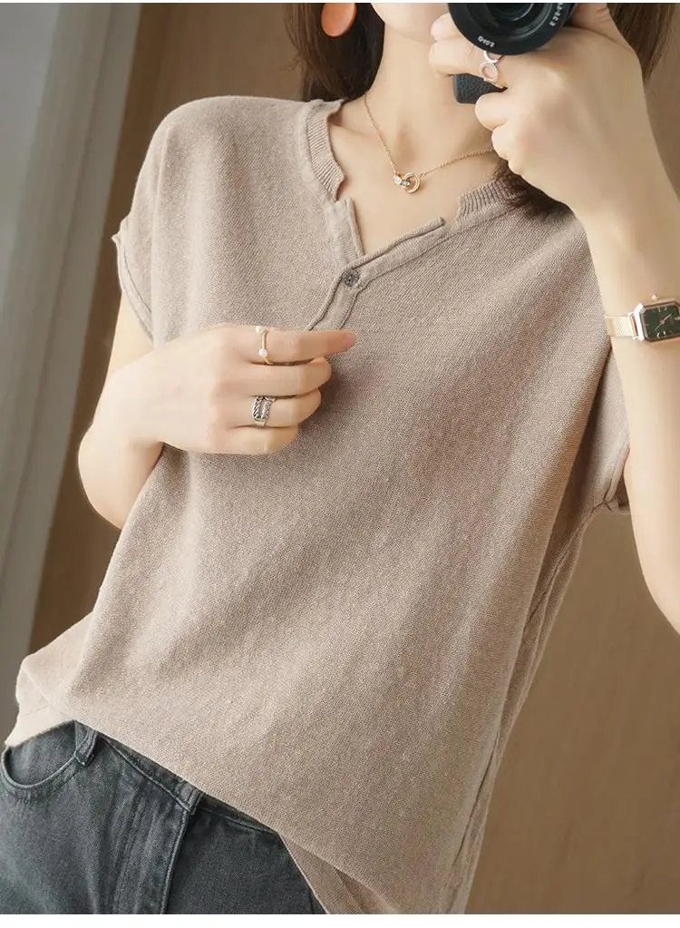 Summer 100% pure cotton women's T-shirt V-neck knitted short sleeved loose Tees solid color pullover button Tops basic versatile
