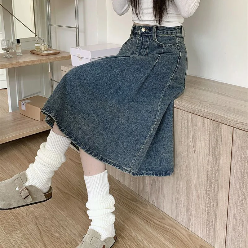 Summer Lady High Waist Thin Pleated Jeans Skirts Women Retro Solid Mid-Long Denim Skirts Girls Casual Fashion A-line Dress